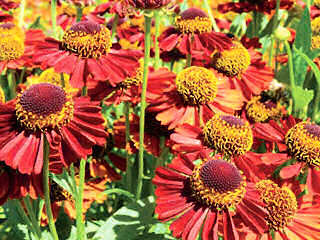 | Trvalkový záhon s většími skupinami odrůd zápleváků (Helenium). Takový typ výsadby vyžaduje nevysychavou půdu nebo pravidelnou závlahu. |